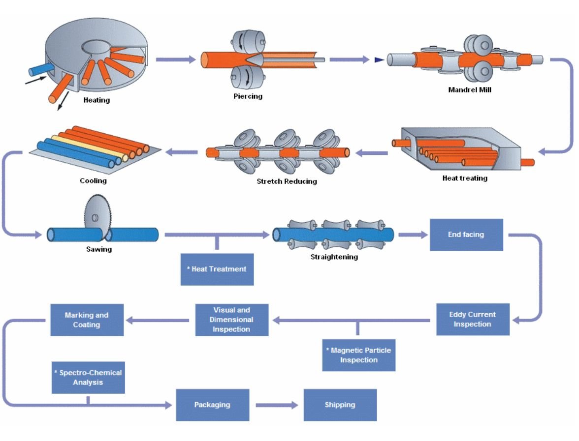 In the Mandrel Mill Process, a solid round (billet) is used. It is heated in a rotary hearth heating furnace and then pierced by a piercer. The pierced billet or hollow shell is rolled by a mandrel mill to reduce the outside diameter and wall thickness which forms a multiple length mother tube. The mother tube is reheated and further reduced to specified dimensions by the stretch reducer. The tube is then cooled, cut, straightened and subjected to finishing and inspection processes befor shipment.